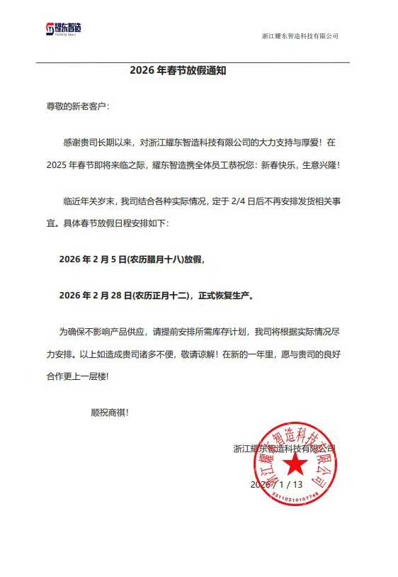 (Zhejiang, [fecha actual]) A medida que se acerca el Año Nuevo Lunar, varias industrias han comenzado su período de revisión y descanso anual. Hoy, Zhejiang Yaodong Smart Manufacturing Technology Co., Ltd. publicó oficialmente su cronograma operativo del Festival de Primavera, lo que marca la conclusión exitosa de sus esfuerzos de producción y entrega para 2025 y el inicio del sprint final antes de las vacaciones.